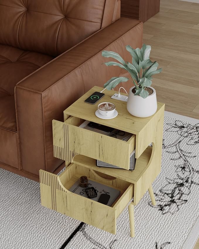 • Small Side Table for Small Spaces:This nightstand is small but has a lot of space,with two storage drawers and open wood shelf that provides a perfect storage space for your remote control, glasses, medicines and other essentials close at hand. The wide top is perfect for displaying a lamp, clock, potted plant or photo frame to offer warmth and personalized decoration.