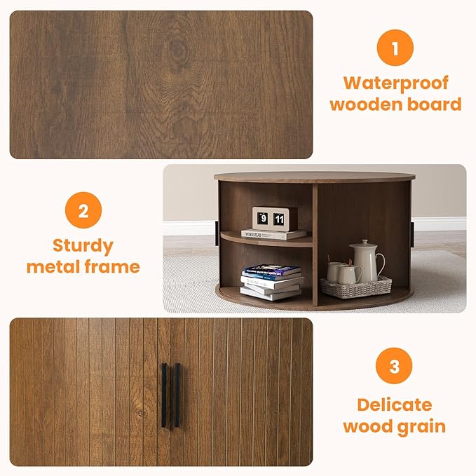 Coffee Table with Storage,31.5" Wood Round Coffee Table Hidden Storage and Open Shelves with 360°Curved Sliding Door,for Living Room Office Apartment,Brown