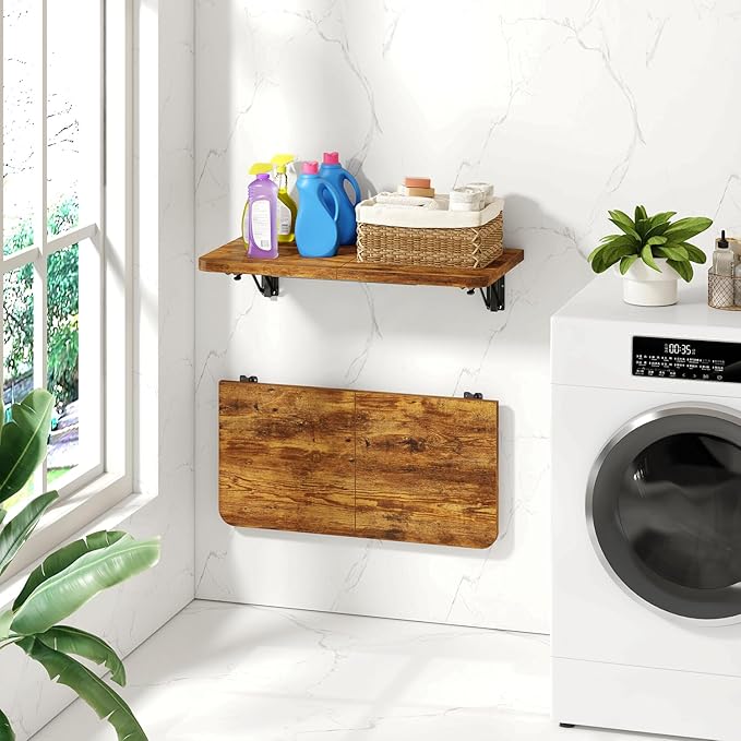 IBUYKE Wall Mounted Folding Table, Floating Wall Desk for Small Spaces, Fold Down Laundry Shelf with Heavy-Duty Brackets, Wall Table for Home Office/Bar/Kitchen/Dining, Rustic Brown UTVT005H