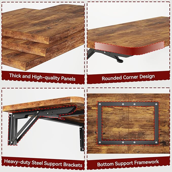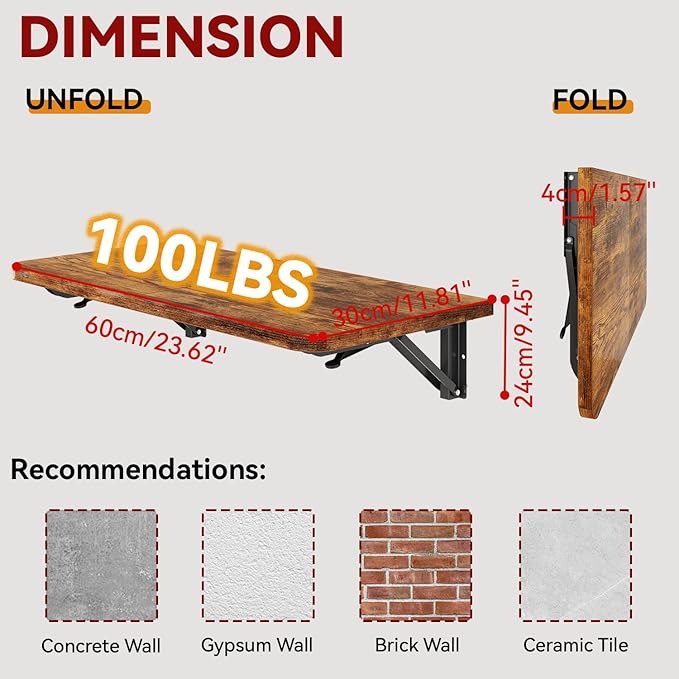 • 【Wall Mounted Shelf】This folding table consists of heavy-duty steel supports, a sturdy bottom support structure, and medium density fiberboard, with a weight capacity of up to 80 pounds. Sized at 23.6x11.8x 5.9 inch, this versatile piece isn't just a desk—it also serves as a study area, dining spot, or display table.