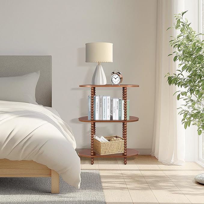• 3-Tier Storage Shelf: This slim side table features a versatile 3-tier open design, offering ample storage: the top tier holds drinks or snacks, the middle and bottom shelves are perfect for displaying books, dried flowers, photo frames, small plants and other decorative items to keep your space tidy and organized