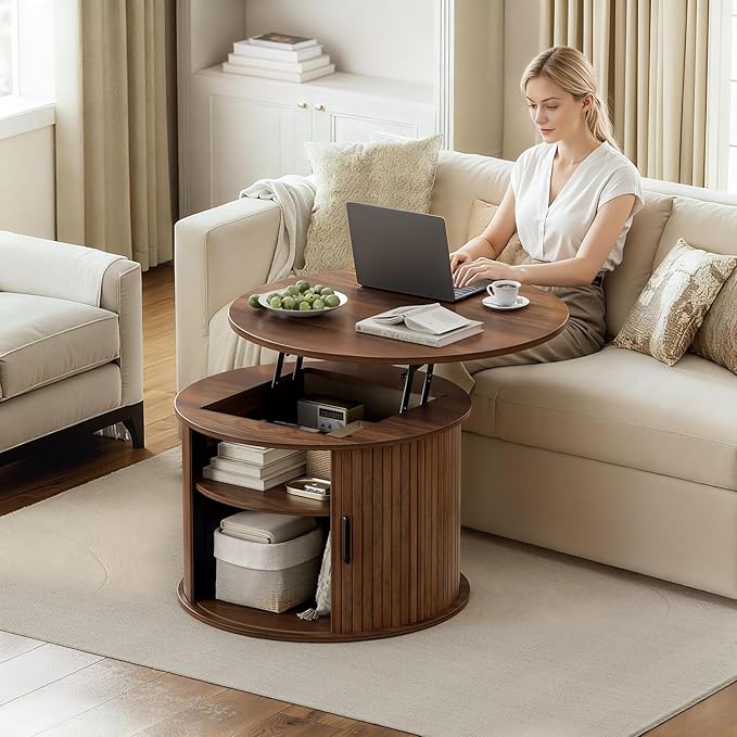 FABATO Round Lift Top Coffee Table, Fluted Wood Accent Coffee Table with Hidden Storage and Open Shelves, Drum Table with Sliding Rolling Door, Small Center Table Dining Table for Living Room, Walnut