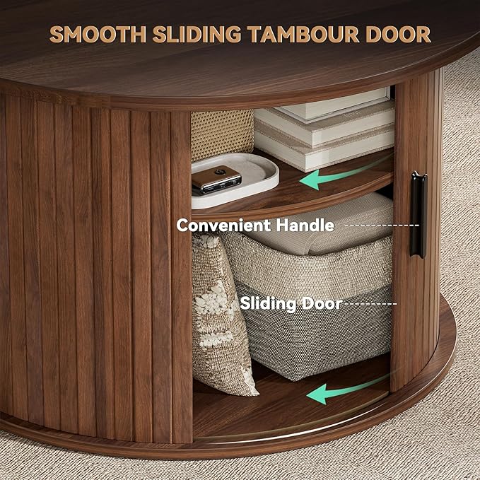 • Curved Sliding Door: This circle coffee table features fluted tambour doors that slide smoothly along a curved groove. Small circle coffee table comes with hidden storage and 2 tier shlef space, offering easy reach to your essentials while keeping clutter hidden