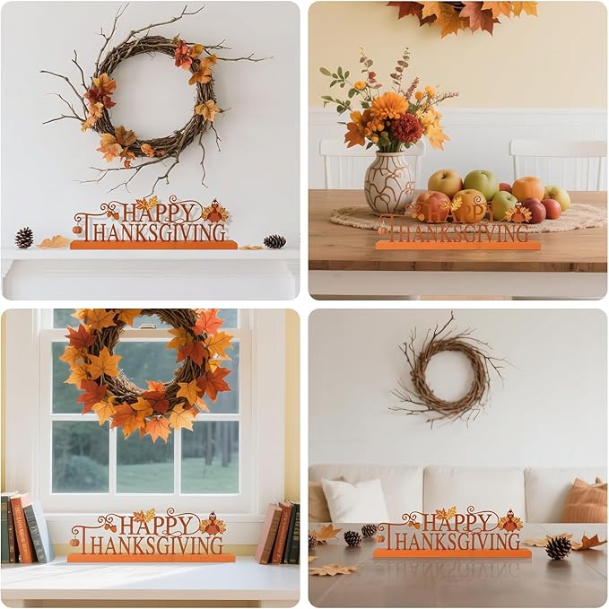 • CHARMING THANKSGIVING CENTERPIECE FOR FESTIVE TABLES - Elevate your dining experience with this rustic wooden base and ironHAPPY THANKSGIV. Featuring whimsical turkeys with maple leaf tail feathers, acorns, and UV-printed details, it doubles as fall table decor and thanksgiving centerpieces for dining tables. The mini pumpkin charm adds a playful touch to autumn decorations or harvest decor setups