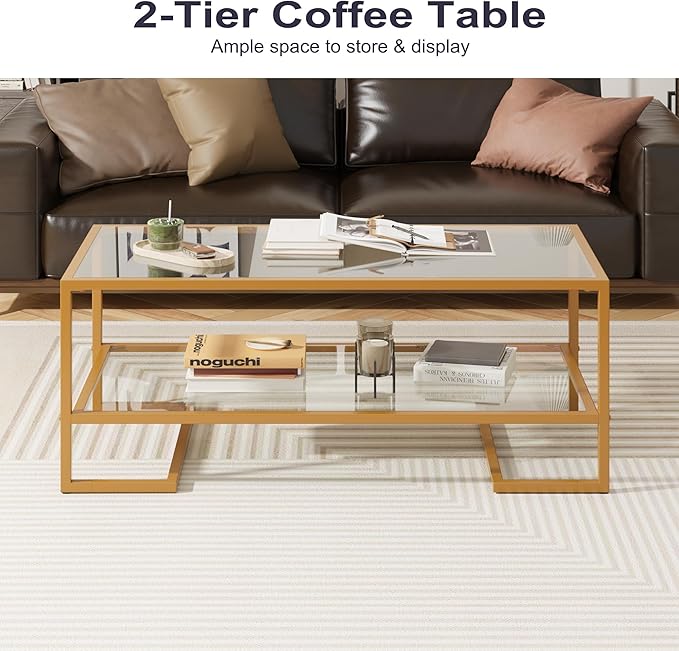 Coffee Table, 2 Tier Tempered Glass Coffee Table, Rectangle Modern Center Table with Metal Frame, Glass Accent Table Open Storage Shelf for Living Room, Office, Golden