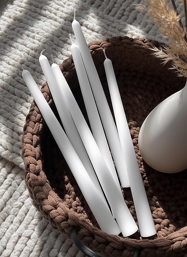 12pk 10" Classic Taper Candles, White, 7-8 Hours Long Burning, Unscented Tall Candlesticks