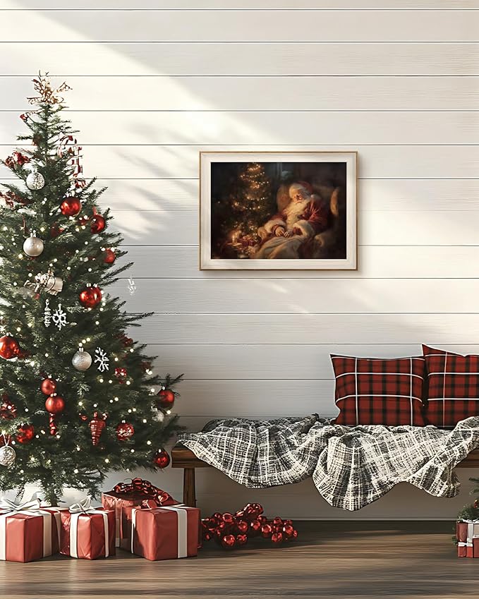 • Capture the essence of Christmas magic: This beautiful wall art perfectly captures the tranquil and magical moment of Christmas, featuring Santa Claus resting on a cozy sofa beside a beautifully decorated Christmas tree, surrounded by gifts. The entire scene is bathed in a warm and inviting glow. This creative light source creates a welcoming atmosphere and effortlessly brings festive cheer and magic to your space.