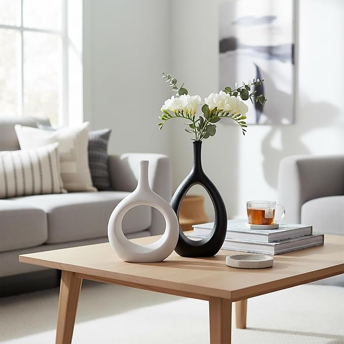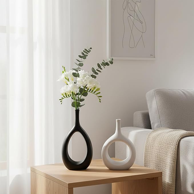 • Unique Design - The hollow ceramic vases, available in donut and water drop shapes, add a vibrant touch of life to your decorated space. Their unique shapes allow them to be used either in combination or individually, while the matching of black and white colors brings a sense of layering to your decorated area.