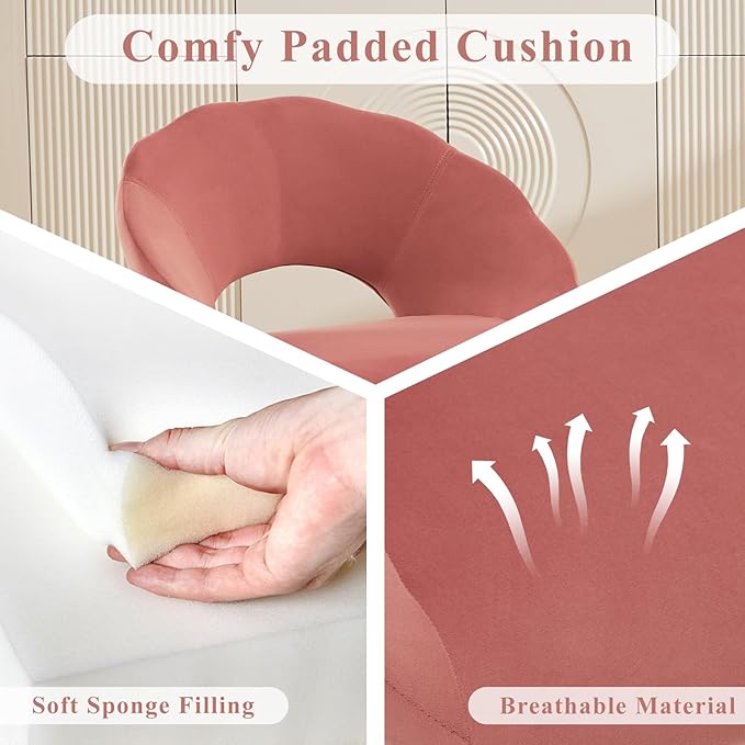 • Vanity Chair with Hollow Back- This velvet chair has a curvy petal shape and a rustic light color that gives it a warm, modern aesthetic. The U-shaped arms give the chair a striking look, and the slightly sloped back makes it easy to sink into.