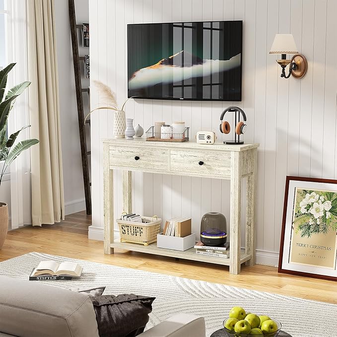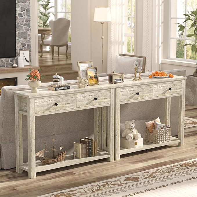 • 【2-Tier Farmhouse Sofa Table with Drawers】Bring style and functionality to your home with this Homieasy farmhouse console table. Featuring a spacious tabletop, 2 smooth-gliding drawers, and a bottom open shelf, it can be used as an entryway table, console table, or hallway table to keep your home neat and stylish.