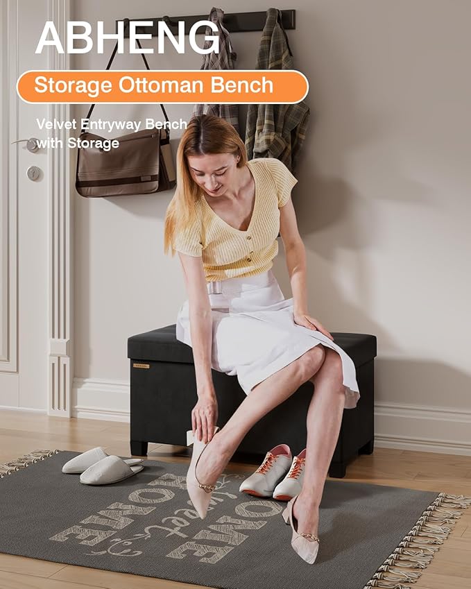 Foldable Storage Ottoman Bench, Velvet Footrest and Seat Cube with Feet, Storage Chest, for Living Room, Bedroom and Office, 15 x 30 x 15.7 Inches, Ink Black,ASND23B