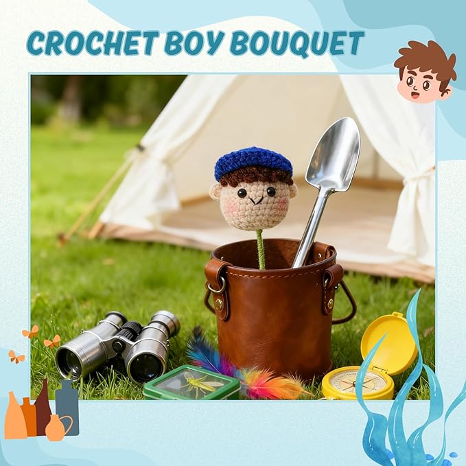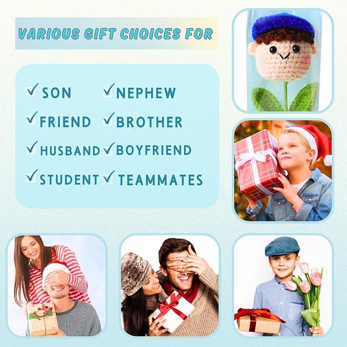Crochet Handmade Flower Doll Bouquet Gift for Him, DIY Knitted Gifts for Home Office Desk Decor, Gift Ideas for Son Boy Boyfriend