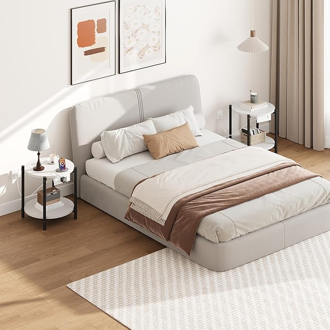 LIKIMIO Round End Tables, Set of 2, 16" W Small Round Side Tables with Charging Station, 2-Tier Modern Nightstands for Small Spaces, Living Room, Bedroom, White