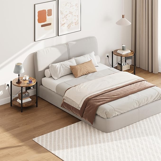 LIKIMIO Round End Tables, Set of 2, 16" W Small Round Side Tables with Charging Station, 2-Tier Modern Nightstands for Small Spaces, Living Room, Bedroom, Rustic Brown
