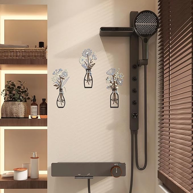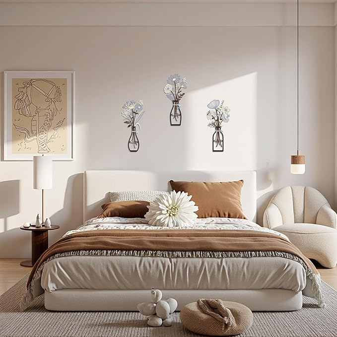 Iron Metal Vase Flower Wall Art Minimalist Black Floral Decor for Living Room Bedroom Kitchen, Office Garden - Modern Farmhouse Home Decor & Housewarming Gifts (Beige-Blue No Text)