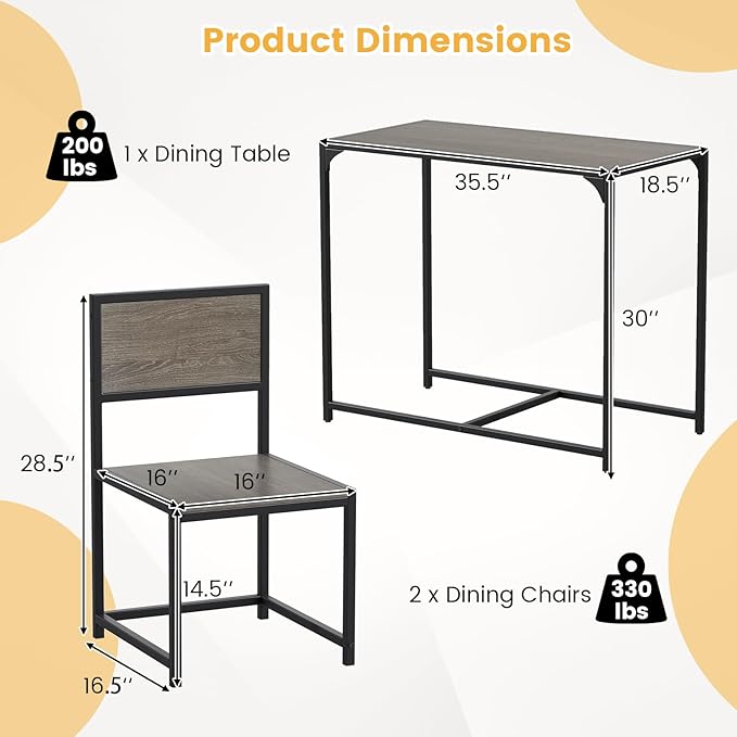 • Easy Assembly & Dimensions: With a straightforward assembly process and detailed instructions, setting up this dining set is a breeze. The table measures 35.5" x 18.5" x 30" (L x W x H), and each chair measures 16" x 16.5" x 28.5" (L x W x H), with a seat height of 14.5".