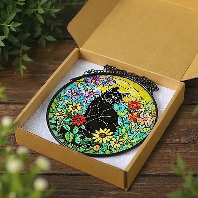 Black Cat Stained Glass Window Hanging, 8 Inch Sun Catchers Indoor Window, Suncatchers for Windows Hanging, Home Decor and Christmas, Festival, Mother's Day, Birthday, Gifts for Women, Men, Cat Lovers