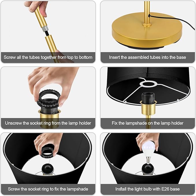 • 💡【Easy Assembly and premium quality】Made with gold metal body and black linen lampshade, the boho floor lamp is simply designed and look good in any surroundings; With the 6lb sturdy base, this 58-inch (5ft) tall lamp stands steadily and won't tip over easily, which is safe for kids; Without tools required, you just need to screw all the parts together to finish the assembly of this standing lamp; PS. The assembly video is attached to the product page
