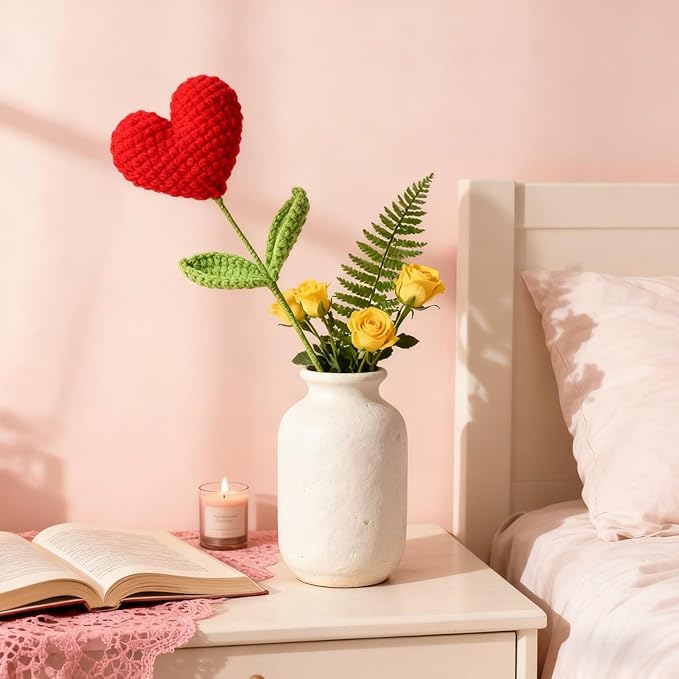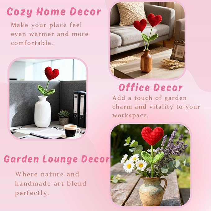 Hand-Crocheted Heart Flower Doll Bouquet - DIY Knitted Desk Decor, Romantic Gift for Girlfriend Valentine's Birthday Anniversary, Home Office Decoration