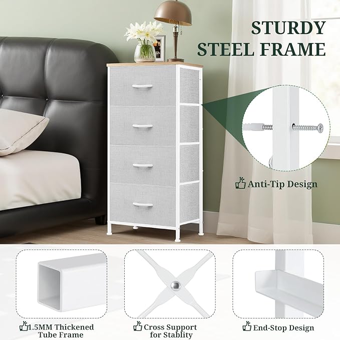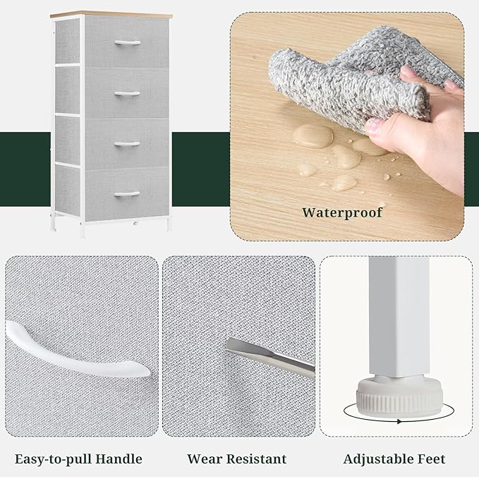 • 【Spacious 4-Drawer Storage】 Features four deep fabric drawers and a durable wooden top, providing ample space for clothes, accessories, books, and household essentials while keeping your space neat and organized.