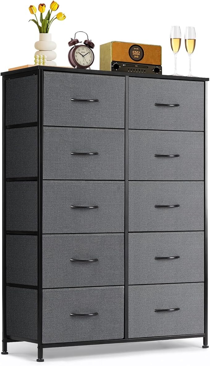 10-Drawer Dresser for Bedroom, Anti-Tip Tall Storage Organizer Chest of Drawers with Wooden Top and Metal Frame Fabric Bins for Closet, Living Room, Hallway, Entryway, Gray