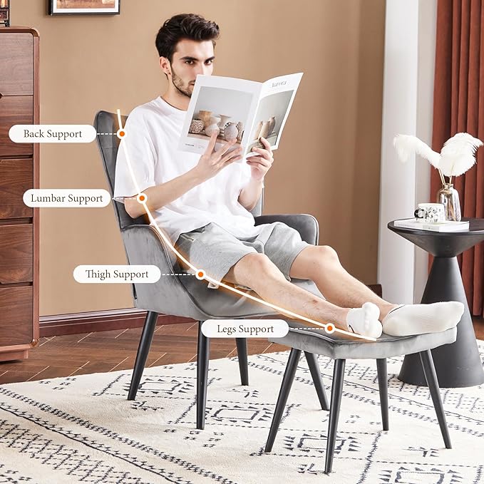 Furniliving Velvet Accent Chair with Ottoman, Upholstered Reading Chair with High Backrest, Tufted-Button Wingback Armchair for Bedroom, Dressing Room, Home Office, Grey