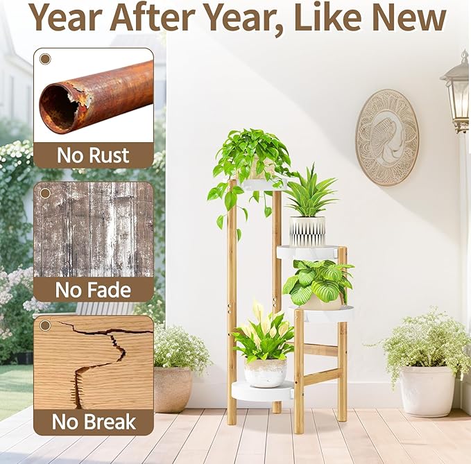 • 【Sturdy Support for Your Plants】Your favorite heavy plant standing tall and secure. That’s what reinforced bamboo frame and thickened plastic tray offer. They’re designed to handle the weight, so you can trust that your plants are secure and stable, no wobbling or tipping over.