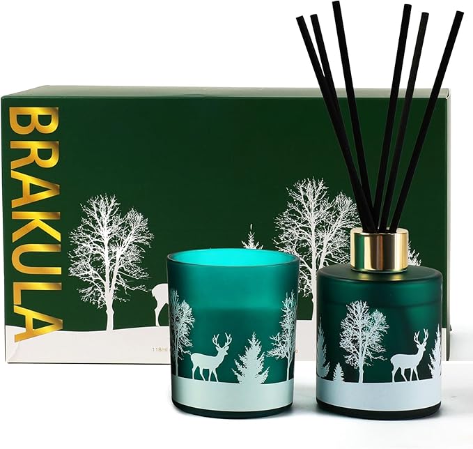 Brakula Christmas Reed Diffuser and Candles Set, 2 Pack/Total 8 oz, Fireside Juniper & Balsam Scented, 6 Diffuser Sticks with Christmas Bottle Design, Home Decor Bedroom Living Room Office