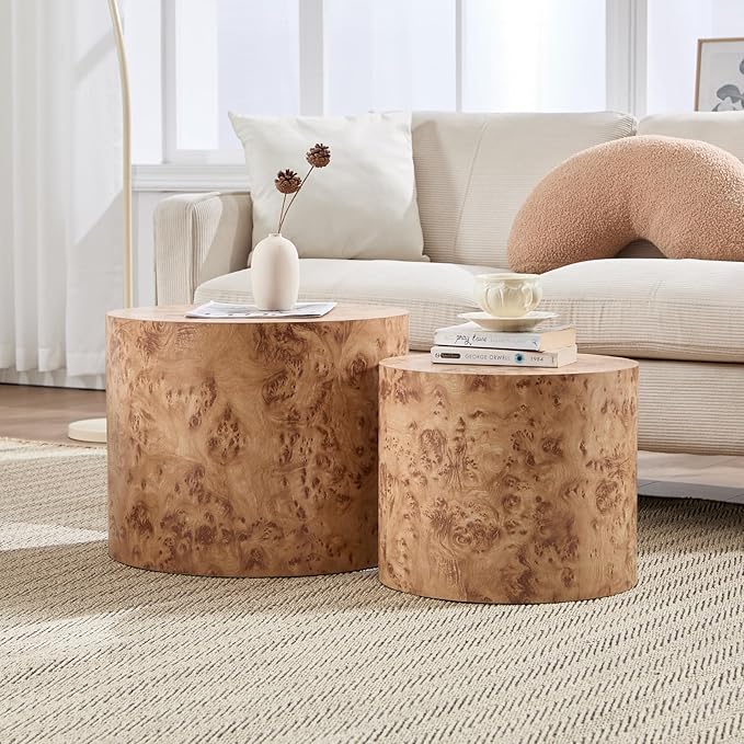 Round Coffee Tables Side Table Set of 2, Wood Nesting End Table for Living Room Balcony Office, Walnut Wooden Color, Natural Burl Color, No Assembling