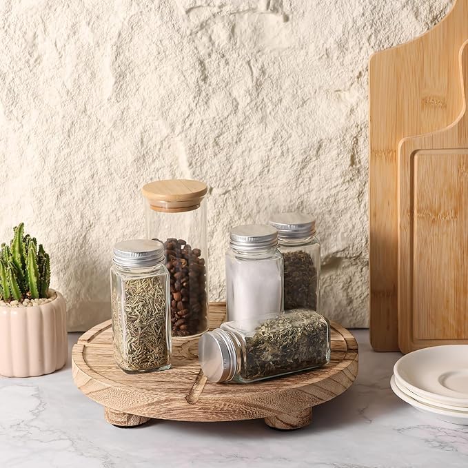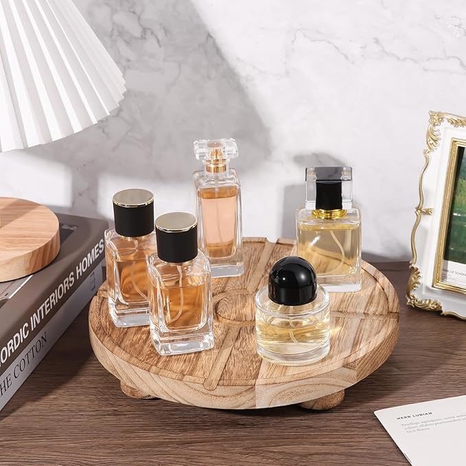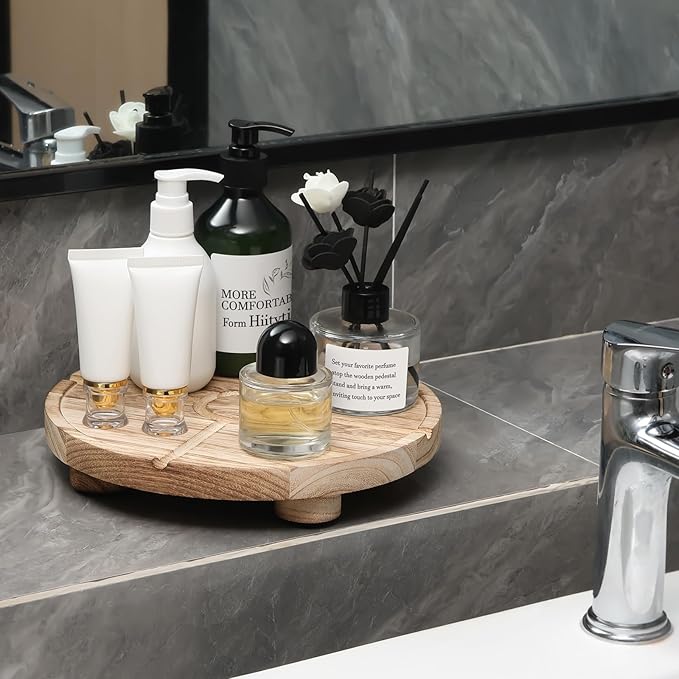 • [Thoughtful Design with Practical Details] Crafted in a 10" round shape, this wooden pedestal tray stands on four sturdy cylinder legs, each fitted with anti-slip pads for stability. The tray surface includes drainage grooves, adding beauty and practicality for bathroom or vanity use
