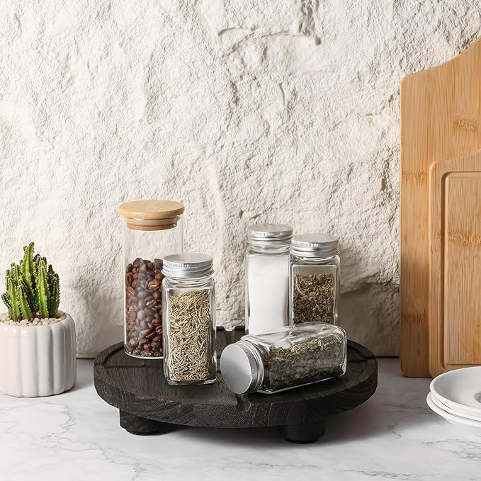 • [Thoughtful Design with Practical Details] Crafted in a 10" round shape, this wooden pedestal tray stands on four sturdy cylinder legs, each fitted with anti-slip pads for stability. The tray surface includes drainage grooves, adding beauty and practicality for bathroom or vanity use