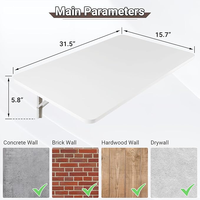 • Wall Mounted Folding Table: The collapsible wall desk features coated solid medium density fiberboard and heavy duty folding steel brackets, which is sturdy and durable