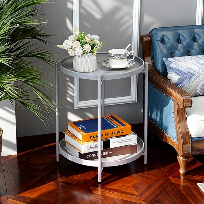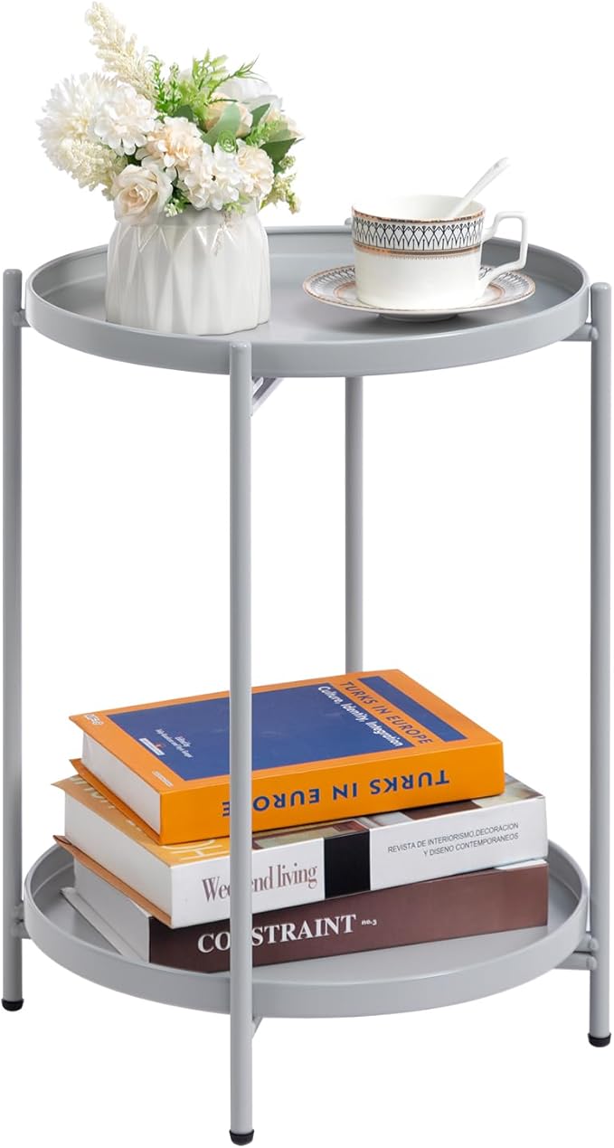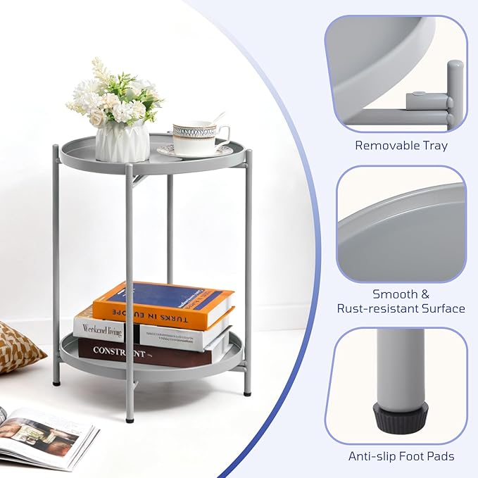 HollyHOME 2-Tier Round Side Table, Outdoor Small Folding Accent Stand with Removable Tray, Anti-Rust Metal Asional Table for Balcony Patio Living Room, Nightstand for Bedroom(Grey)