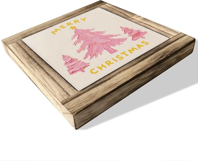 Merry Christmas Wood Sign, Pink Christmas Tree Decor, Wood Plaques Desk Decors, Decorative Wooden Box Sign, X-mas Home Decor for Living Room Bedroom Table helves, X-mas Gift for Girls Women