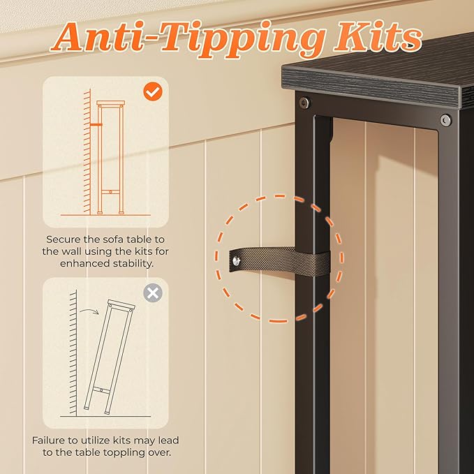 • 【Strong, Stable & Safe】Made from high-quality engineered wood and a sturdy metal frame, this behind the sofa table is built for daily use. Anti-tip kit included for wall-mount safety, plus upgraded larger adjustable feet keep it steady on uneven floors, much more stable than smaller leg bases