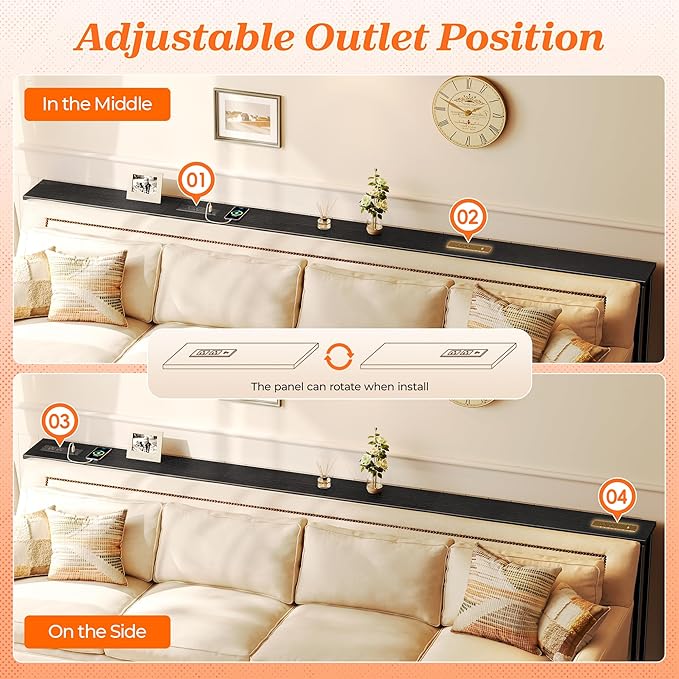 • 【Flexible Power Outlet】This 102.4-inch long console table features a built-in power outlet with 2 AC ports, 1 USB port, and 1 USB-C port. Designed for ultimate flexibility, the outlet can be installed in 4 different positions to perfectly fit your space and setup. Easily charge your laptop, phone, tablet, or game controller without reaching behind furniture — power and convenience, exactly where you need it