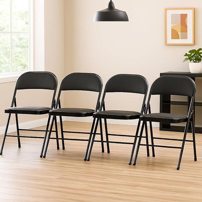 4 Pack Black Folding Chairs with Padded Seat & Back, Metal Frame Foldable Chairs, Portable & Stackable for Indoor Outdoor, Office, Party, Wedding, Conference