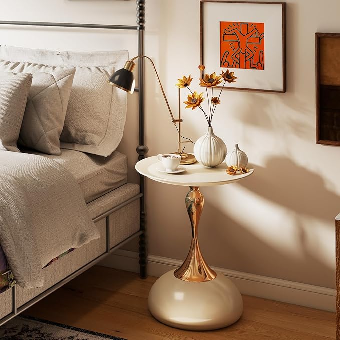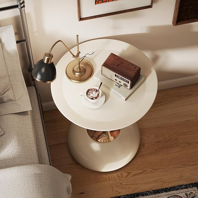 Metal Round End Table,Modern Pedestal Table,Corner Drink Tables,Accent Side Table Nightstand for Living Room,Patio and bar (Cream White)