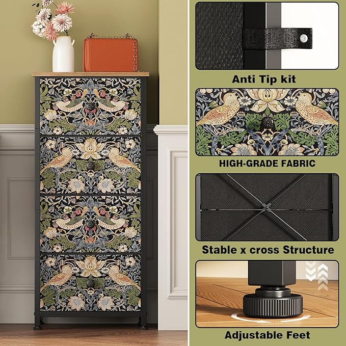 • 4 Fabric Drawers Large Capacity: Each Drawer size: L-14.6" x W-8.3" x H-11", overall dimensions: 16.5"(L) x 11.8"(W) x 36.6"(H). There has 4 Strawberry Thief style fabric drawers, easy-pull wooden handles help open and close the drawers smoothly, which is practical and fashionable.