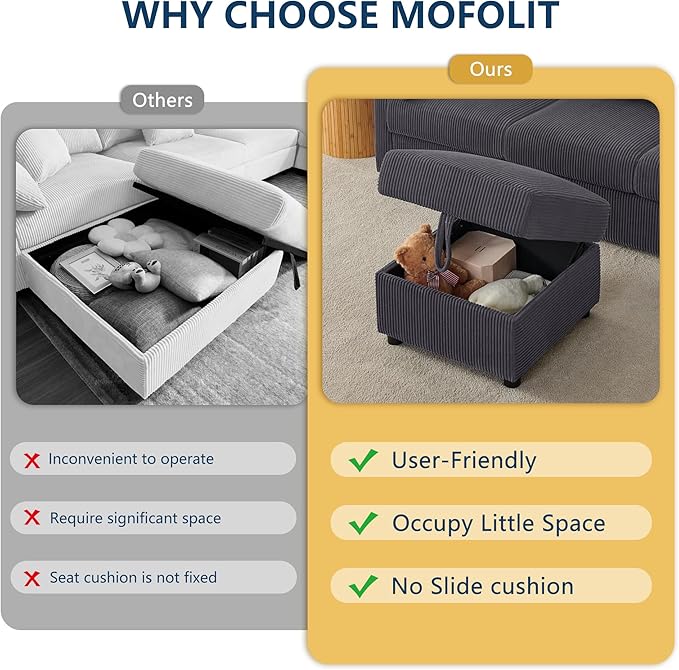 • 【Durability Seat 】The seat cushion of this storage ottoman is 7 inches thick, featuring corduroy fabric, high-density foam, spring packs, and thickened S-shaped springs. It combines softness, high elasticity, breathability, and durability, with a weight capacity of up to 299 lbs, allowing this storage bench to serve multiple purposes.