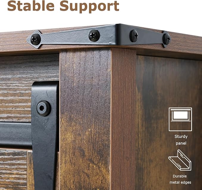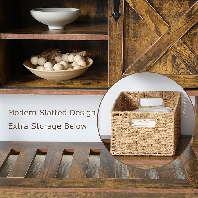 • Sliding Barn Doors & Ample Storage: Features rustic sliding barn doors with adjustable shelves, providing organized storage for kitchen essentials, making it an ideal buffet cabinet or coffee bar
