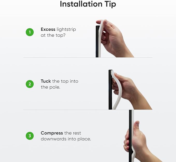 • 【Setup Tips】Please watch our setup video before assembly. Insert the Silicone Lightstrip into the top of the Pole. Wrap your hand around the Pole and firmly push the Lightstrip into place using the ball of your palm. Ensure the end of the Lightstrip aligns with the Top Cap. If you have excess Lightstrip after assembly, DO NOT cut it. Instead, press and slide the Lightstrip slightly upwards and downwards along the pole until it gets into the right position.