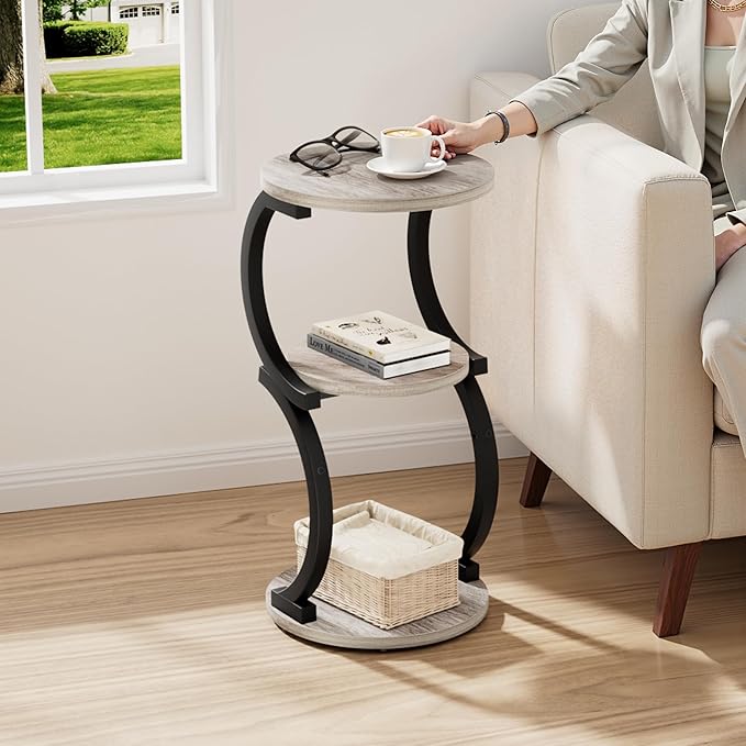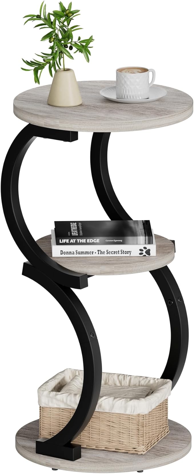 JUSTOGO Small Round Side Table, 3-Tier End Table for Living Room, Vintage Nightstand for Small Spaces Sofa Couch Corner Bedside Bedroom, S-Shaped Wood Accent Table Matel Coffee Table, Greige