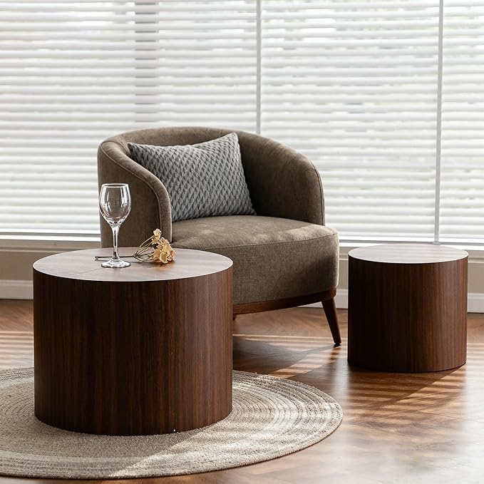 Nesting Round Coffee Table Set of 2, Small Circle Accent End Table for Small Spaces, Morden Drum Side Table, Wooden Center Table for Living Room, Fully Assembled - Dark Walnut