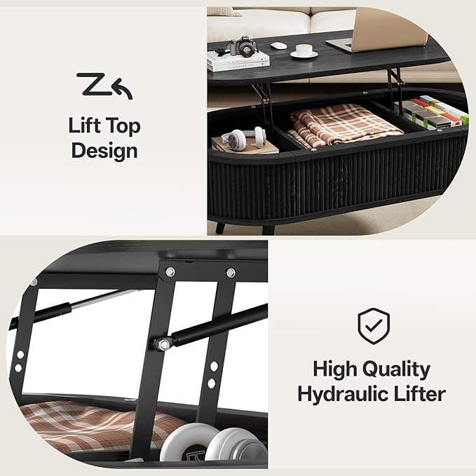 • 【Practical and safe design】 Our hydraulic lift coffee table features a quiet, stable lifting system that raises the tabletop—ideal for ergonomic work, dining, or reading. The 3 large hidden compartment beneath the tabletop is enough to store your often-used items.