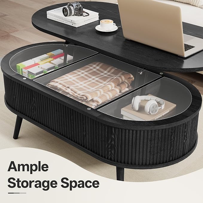 Mid Century Oval Coffee Table, Fluted Center Table with Lift Top, Modern Dining Table with Storage for Living Room Home Office, 39.4", Black