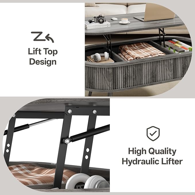 • 【Practical and safe design】 Our hydraulic lift coffee table features a quiet, stable lifting system that raises the tabletop—ideal for ergonomic work, dining, or reading. The 3 large hidden compartment beneath the tabletop is enough to store your often-used items.