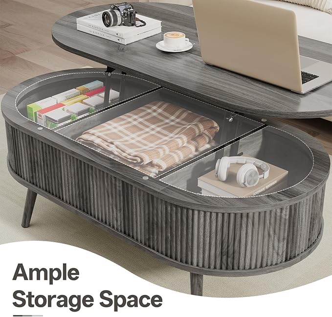 Mid Century Oval Coffee Table, Fluted Center Table with Lift Top, Modern Dining Table with Storage for Living Room Home Office, 39.4", Gray
