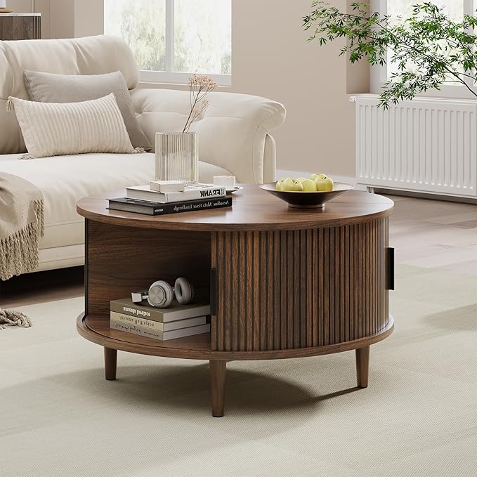 Mid Century Round Coffee Table, Fluted Center Table with Sliding Door, Modern Dining Table with Storage for Home Living Room Office, 31.5", Walnut