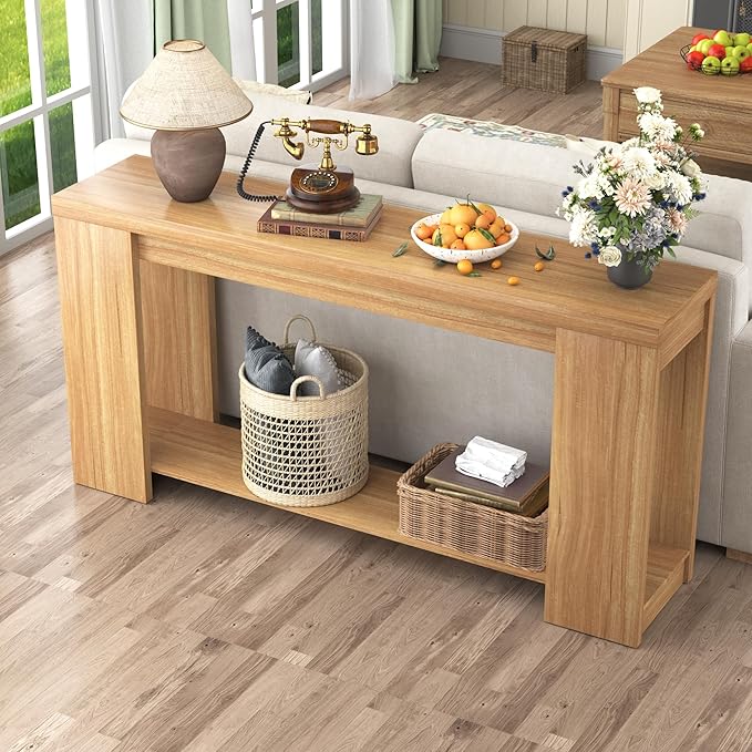 62 Inch Extra Long Console Table with Storage, Farmhouse Wood Entryway Table with Thickened Base, Narrow Entryway Accent Table for Living Room, Hallway, Entrance, Natural Oak